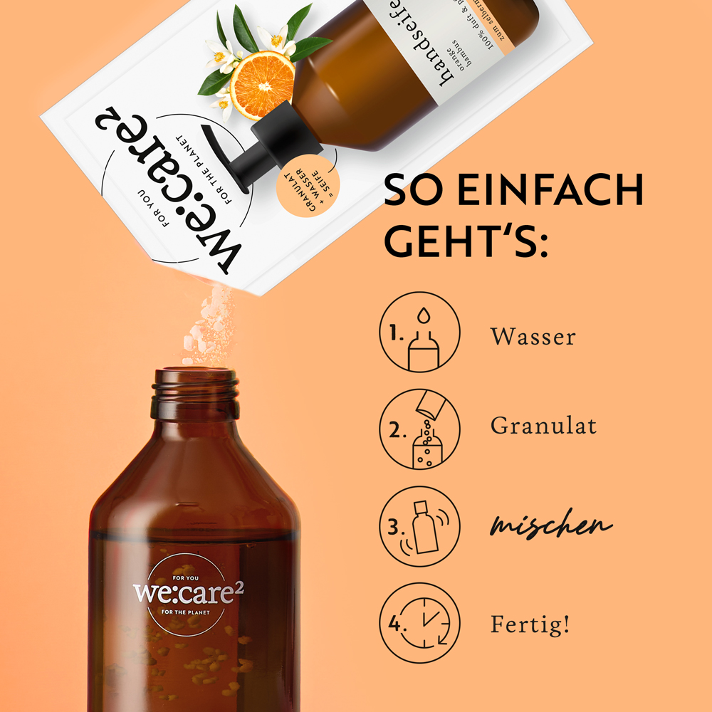 Das Beste: Mit unserem Granulat im Papier-Sachet kannst du ganz leicht 90 % Plastikᴬ und 87 % CO₂ᴮ einsparen. Deine neue Seife ist außerdem biologisch abbaubar und vegan.