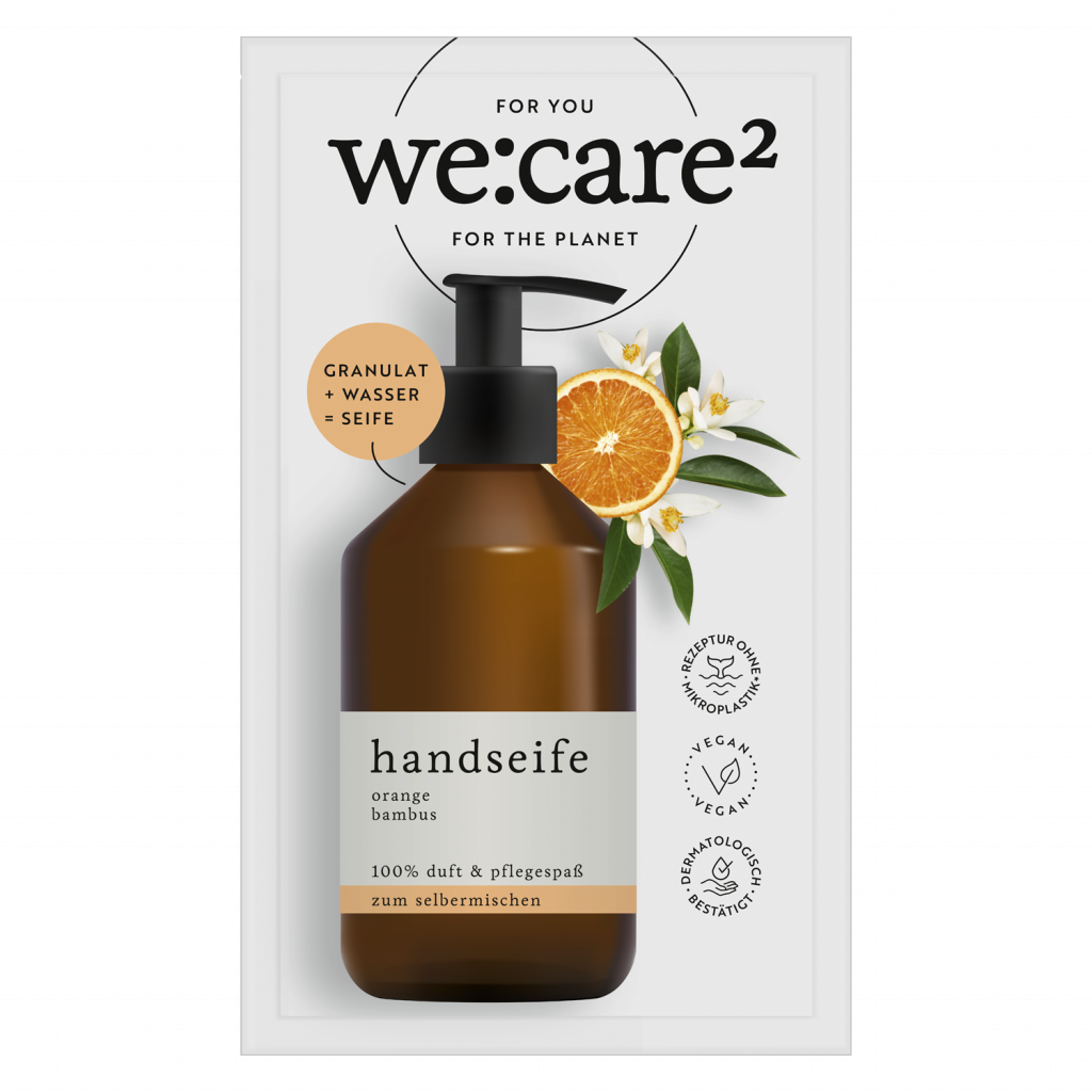 Nachhaltigkeit neu gedacht: Einmal gekauft, kann die we:care2 Flasche oder dein Lieblings-Seifenspender immer wieder mit dem Seifenpulver deiner Wahl befüllt werden
