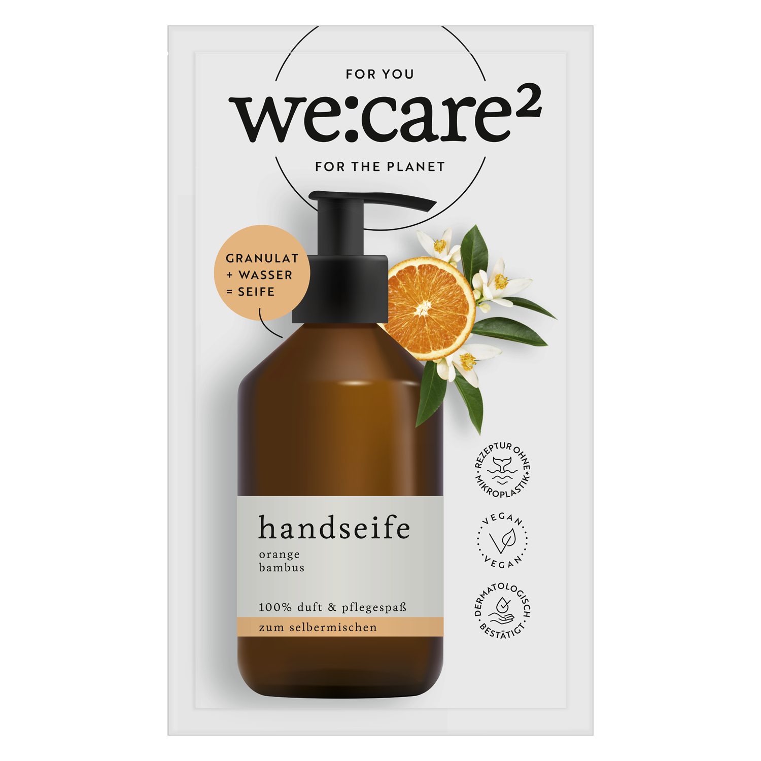 Nachhaltigkeit neu gedacht: Einmal gekauft, kann die we:care2 Flasche oder dein Lieblings-Seifenspender immer wieder mit dem Seifenpulver deiner Wahl befüllt werden